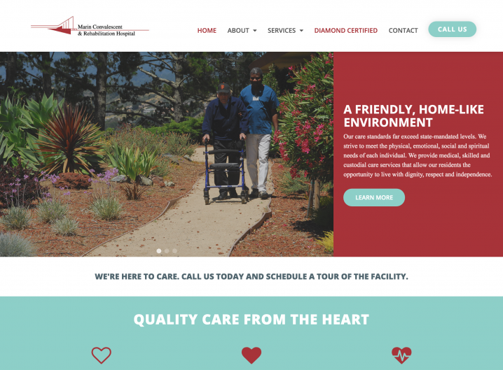 Marin Convalescent came to us courtesy of Diamond Certified. They needed a modern site that showed off their capabilities, services, and friendly home-like environment. Their previous site was out-dated, not secure or mobile friendly. Now it's all of those things and beautiful too!